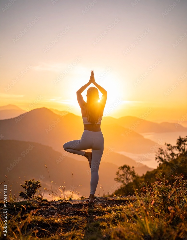 Mujer practicando yoga al aire libre al amanecer, tonos pastel, atmósfera tranquila, equilibrio y bienestar #1776141121