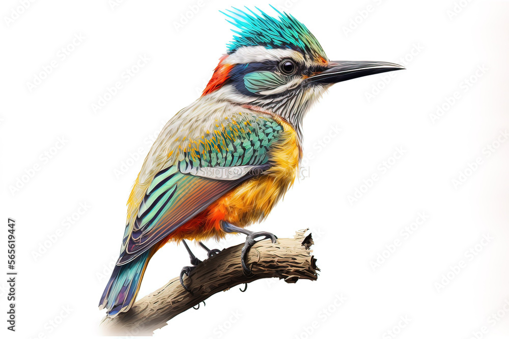 Multicolored tropical and exotic small birds on a white isolated background. AI #565619447