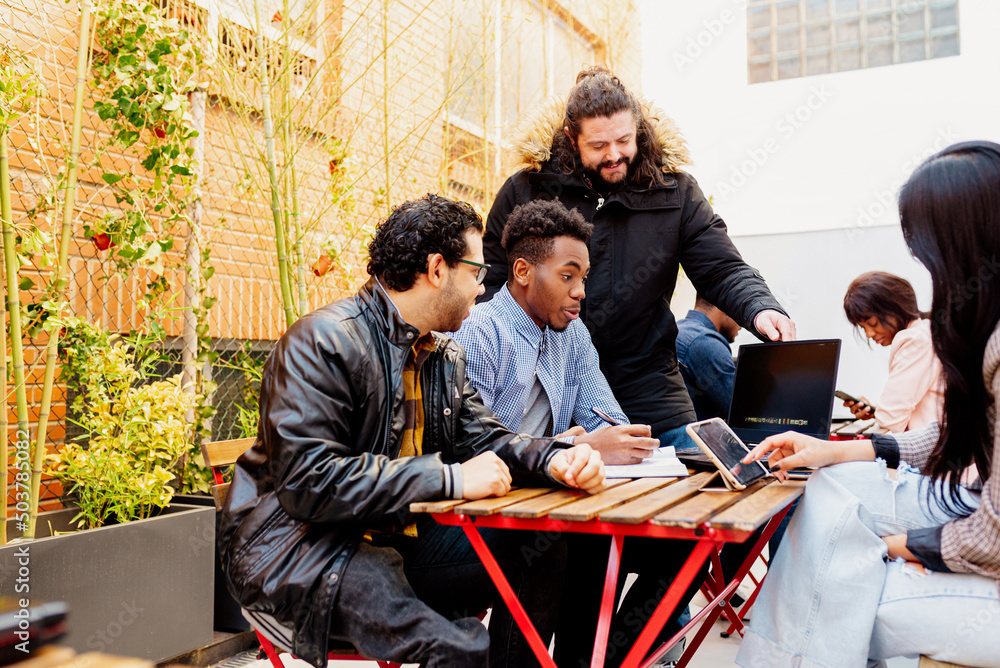multiracial group of coworkers gathered around a laptop working on a project together #503785082