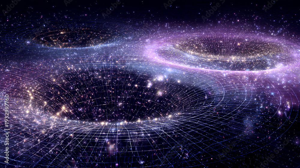 Multiverse gravity field with overlapping curved spacetime grids and glowing quantum nodes cosmic physics concept #1932997760