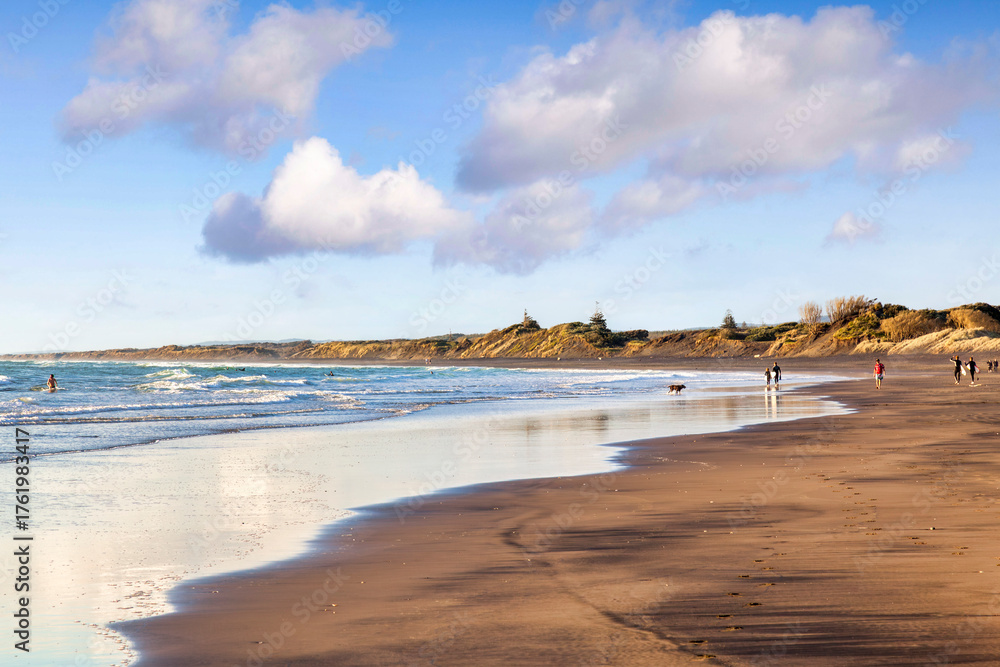 Muriwai Beach, Auckland, New Zealand, with its typical black volcanic sand beach, on a fine summer day. #1761983417