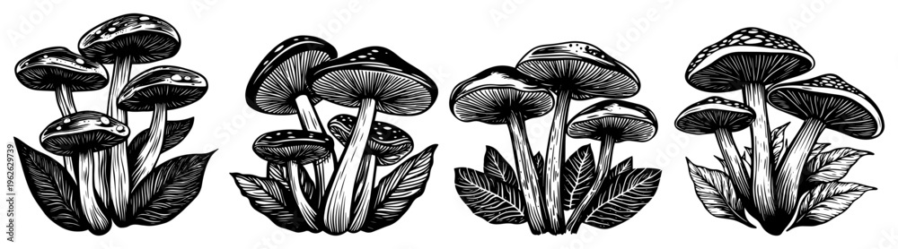 Mushroom Forest Fungi Engraving Style Vector Set, Wild Woodcut Mushrooms with Leaves, Vintage Botanical Nature Illustrations #1962629739