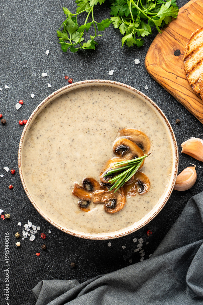 Mushroom soup puree on white kitchen table. #1915140616