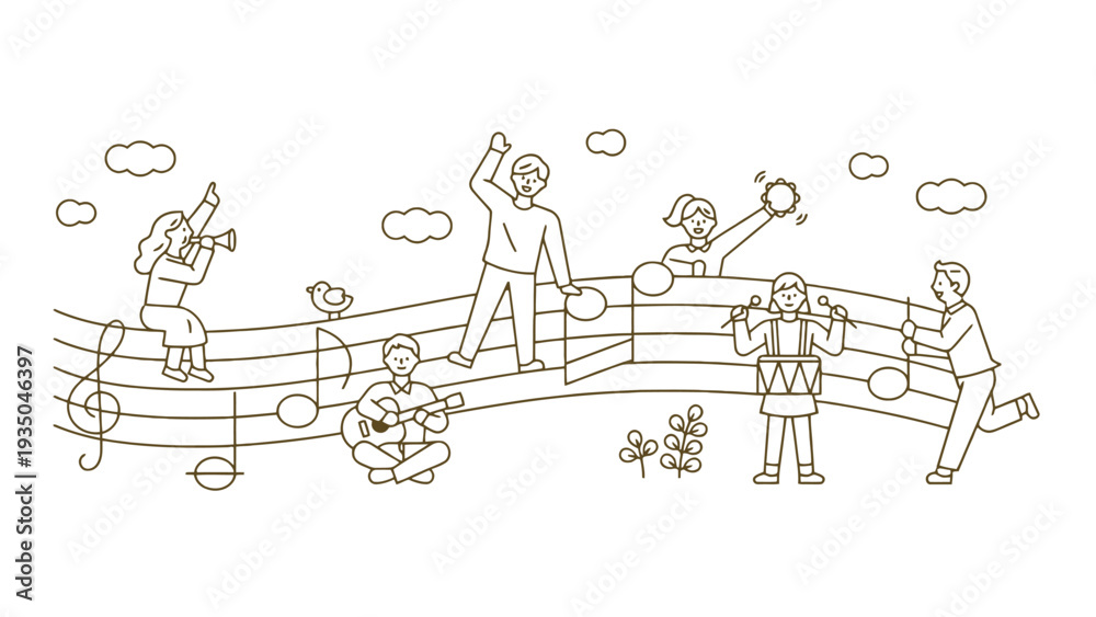 Music illustration of people playing various instruments together happily #1935046397