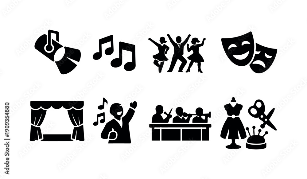 Musical Theater Icons. A musical theater production with actors in vibrant costumes. Filled icon set of A #1909354880