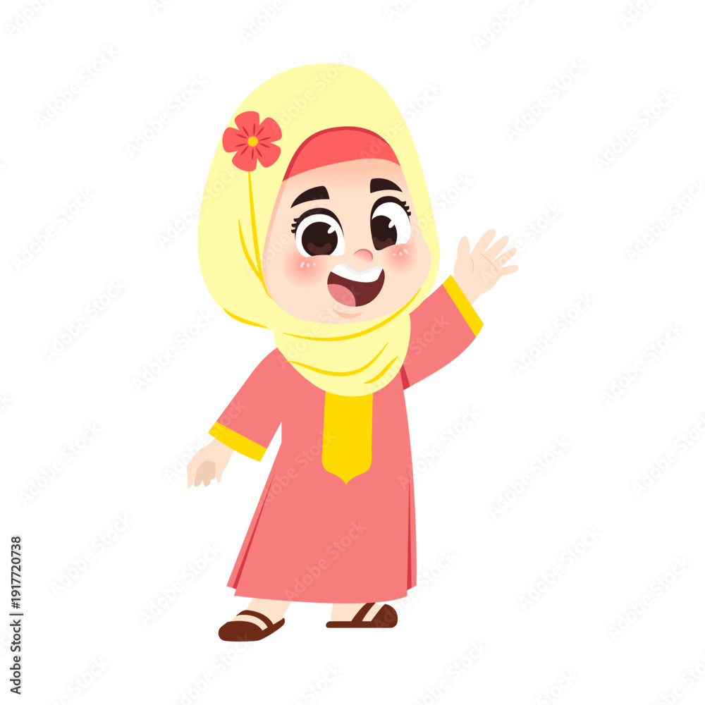 Muslim Girl Red Dress Waving Hand Side Pose #1917720738