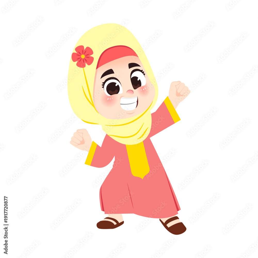 Muslim Girl Red Dress Winning One Hand Fist Pose #1917720877