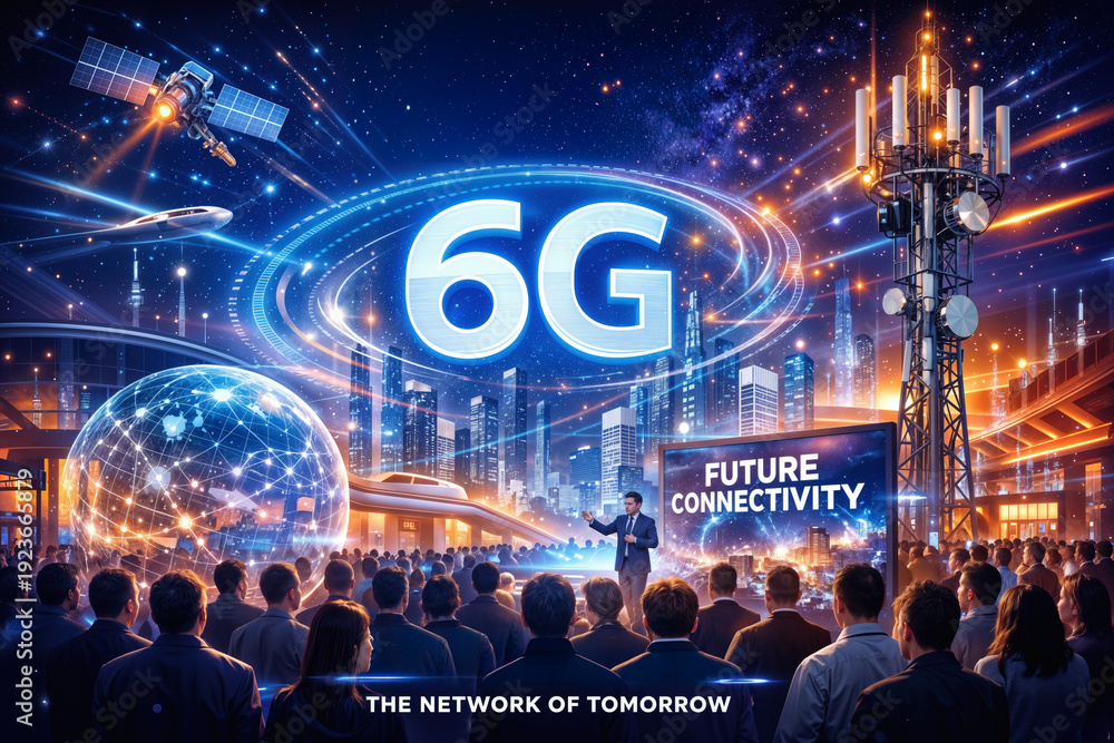 MWC Barcelona March 2-5 2026 6G future connectivity network infrastructure keynote at Mobile World Congress MWC 2026 exhibition technology summit cityscape satellite tower #1923665879