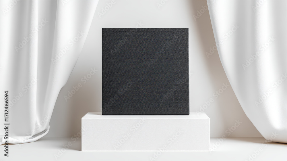 Mysterious black square box on white podium, sophisticated product mockup template for elegant presentation. minimal luxury design with white silk curtain background feels clean and classic #1712466594