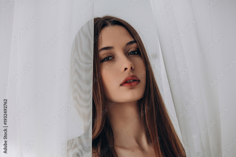 Mysterious brunette peering through delicate white sheer curtains, soft ethereal portrait. #1932492762