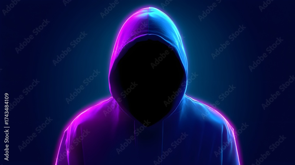 Mysterious figure wearing a hooded sweatshirt glows with vibrant neon light, creating a striking silhouette against a dark blue gradient background, representing anonymity and mystery. #1743484109