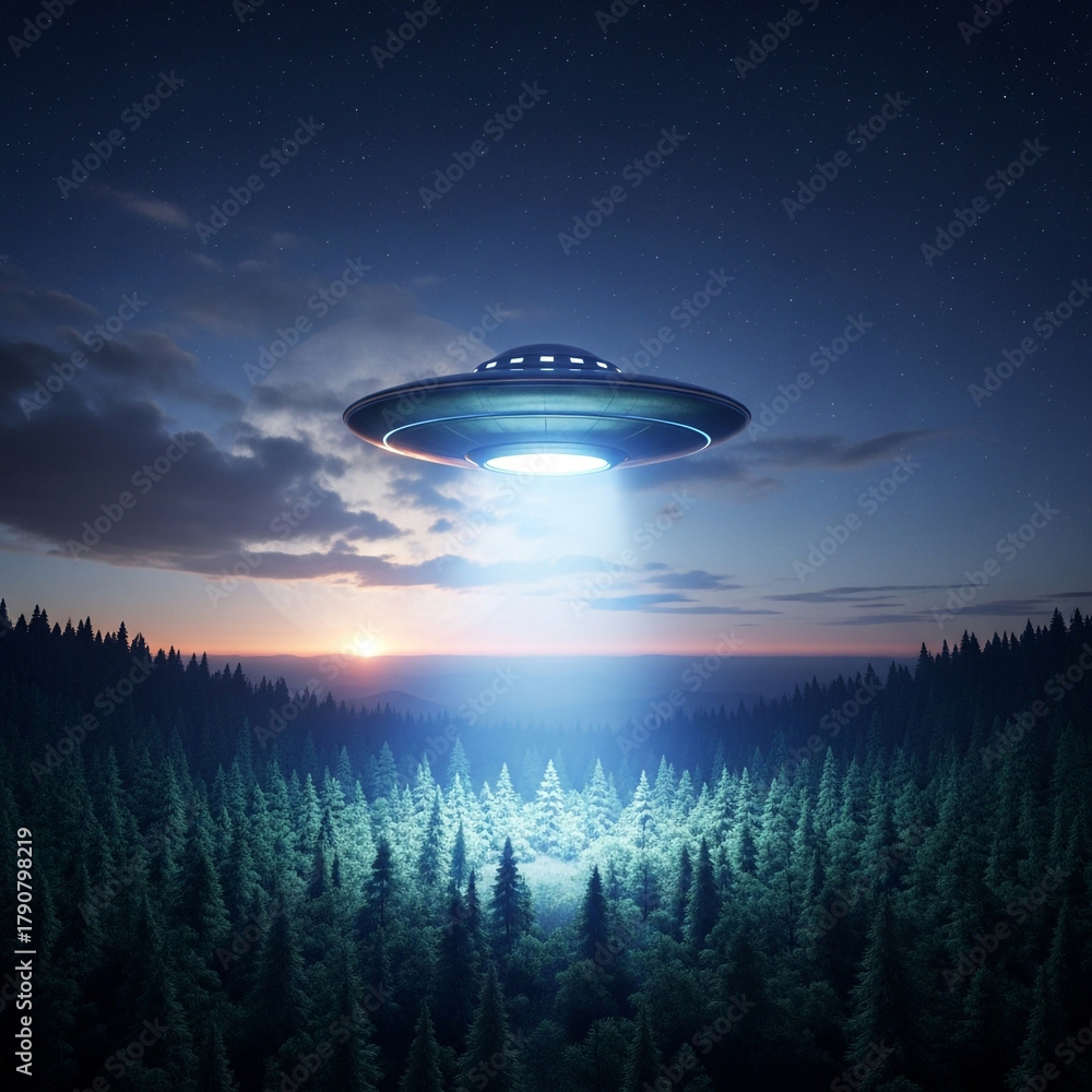 Mysterious ufo hovering over a dense forest at night, casting a beam of light, alien encounter concept #1790798219