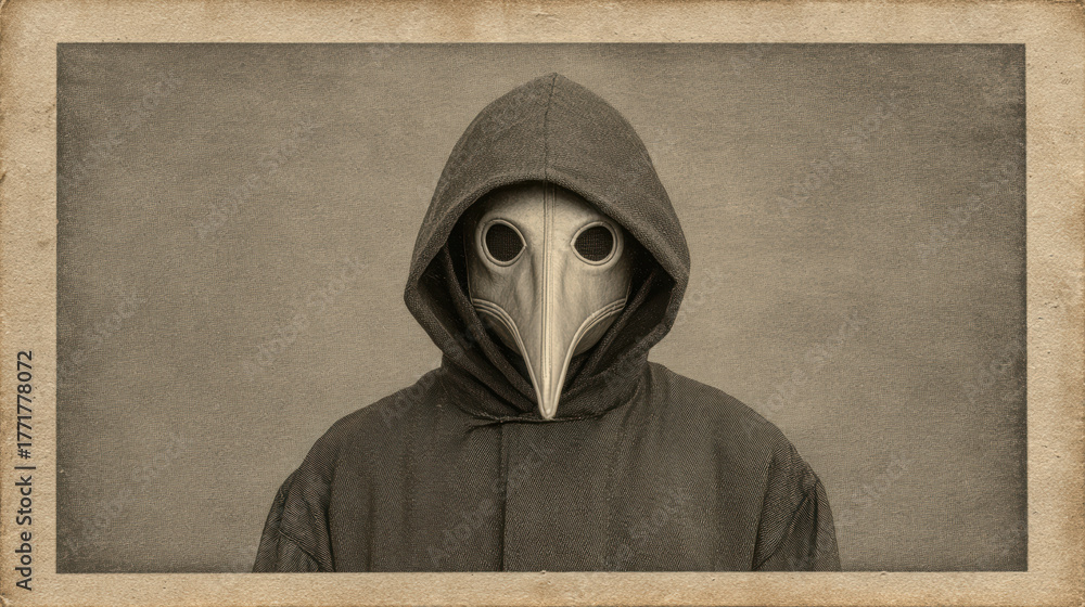 Mysterious vintage portrait of person in historical plague doctor costume. eerie medieval figure wears beaked mask and dark hood in an old sepia photograph #1771778072