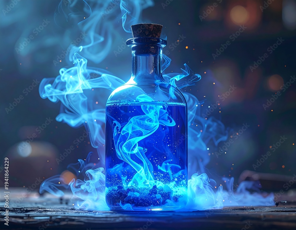 Mystical Blue Potion in a Glass Bottle with Smoke. #1941864229