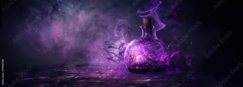 Mystical Elixir in Dim: A mysterious glass bottle glows with an enchanting light, emanating swirling vapors within a moody and obscured ambiance, embodying mystique and fantasy. #1785867168