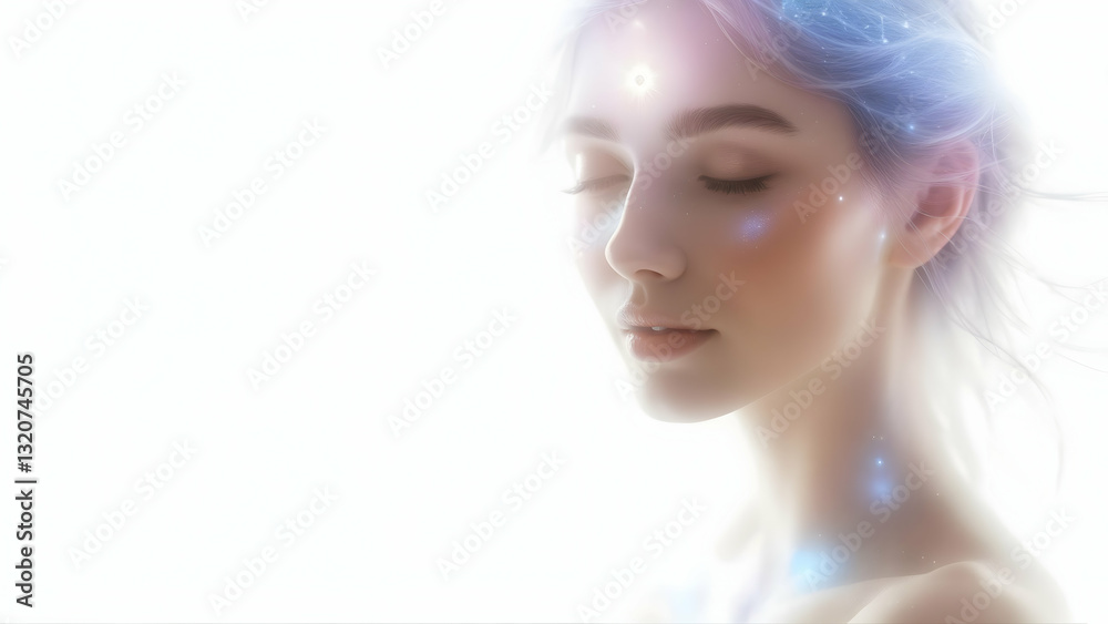 Mystical Glow in Light: An Ethereal Being Poses Under Softbox at 45 Degrees, Framed on the Right Third with Blur for Wellness Ad Enchantment #1320745705