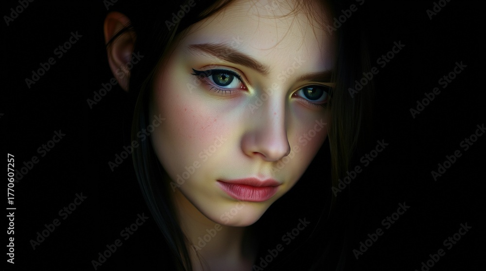 Nahaufnahme eines jungen Mädchens vor dunklem Hintergrund #1770607257