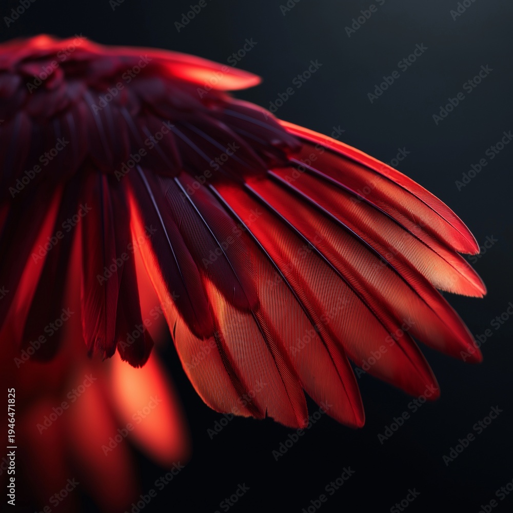 Nahaufnahme eines leuchtend roten Flügels vor dunklem Hintergrund. #1946471825