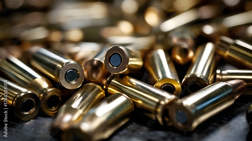 Nahaufnahme von glänzenden Patronenhülsen auf dunklem Hintergrund #1780328104