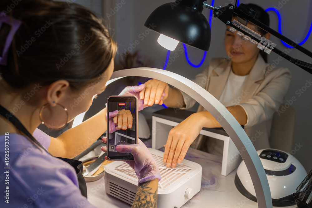 Nail technician photographing finished manicure on female hands using smartphone under ring lamp in beauty salon. Professional nail care, content creation, social media and manicure service concept. #1925073728