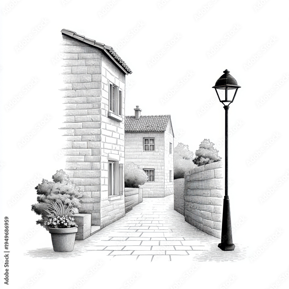 Narrow alley stone house cobblestone path street lamp potted plant Mediterranean village stone wall tiled roof window pathway shrub chimney #1949686959