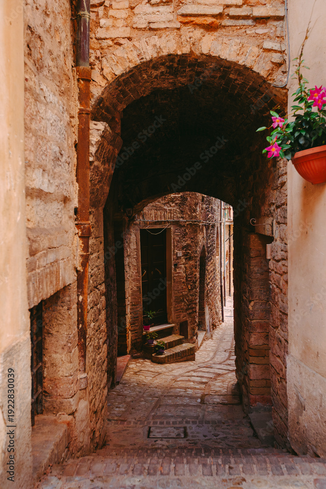 Narrow cobblestone passage with archway in medieval Italian town #1922830039