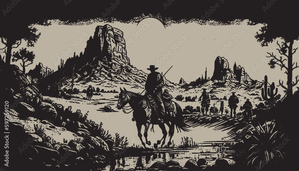 Native american western scene background. Can be used for graphic design. Wild west. Black and white. Graphic Art Vector #597259120