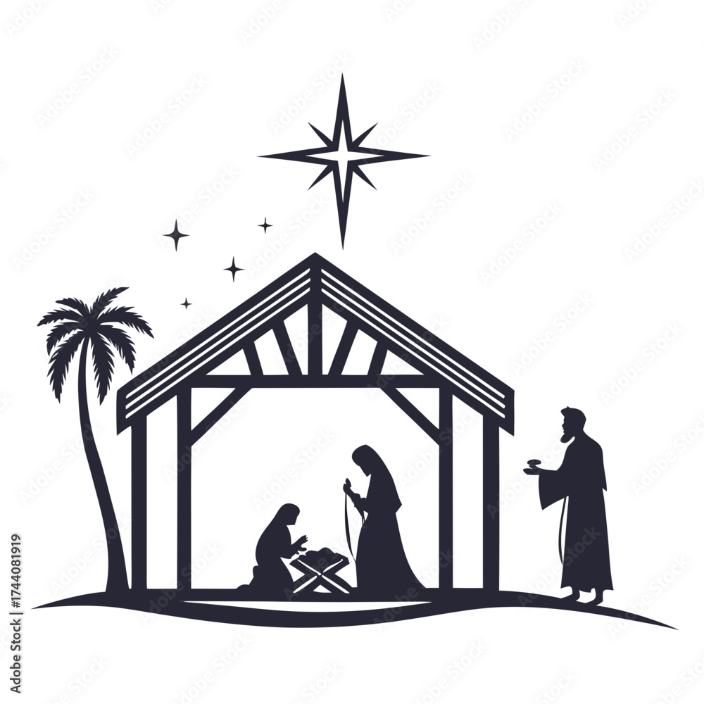 Nativity scene silhouette with the virgin mary joseph baby jesus in a manger the star of bethlehem and a wise man presenting a gift set against a white background with a palm tree #1744081919