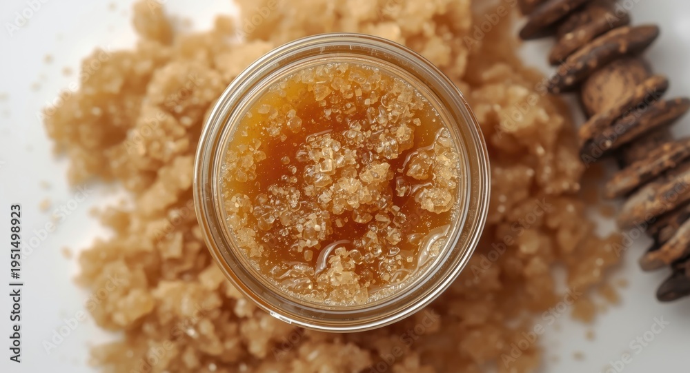 Natural handcrafted lip scrub with olive oil honey and brown sugar in glass container #1951498923