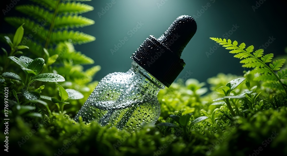 Natural Serum Dropper Bottle in Lush Green Foliage for Organic Skincare Concepts #1776974021