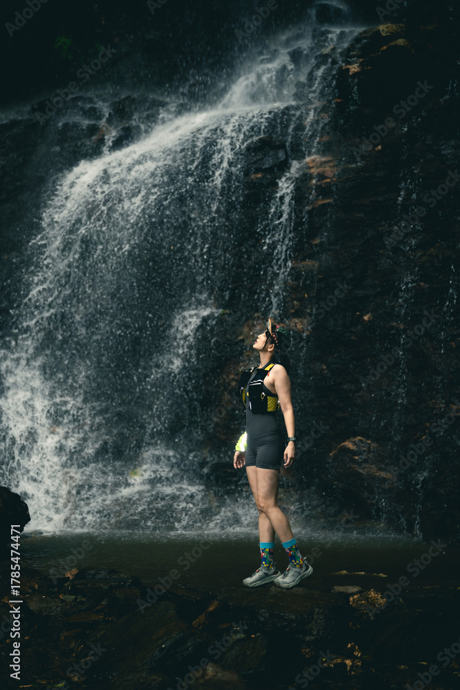 Nature Enthusiast Standing in Front of Majestic Waterfall with Splashing Water in Lush Forest Setting, Capturing Adventure and Serenity in the Outdoors #1785474471