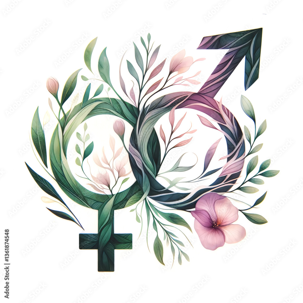 Nature-inspired depiction of masculinity and femininity, blending soft botanical elements with gender representation #1361874548