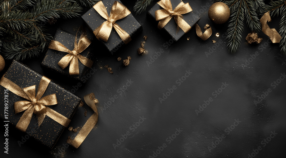 Navidad elegante en negro y dorado, evocando lujo moderno, contraste visual y atmósfera festiva refinada.Regalos negros con lazos dorados rodeados de ramas, esferas y confeti sobre fondo oscuro. #1778927875