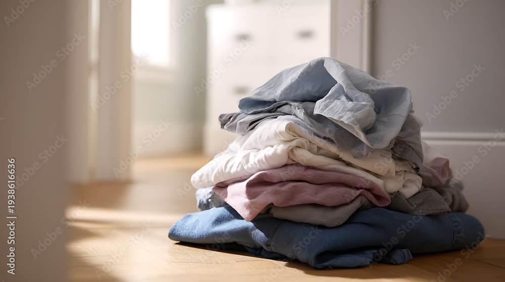 Neatly folded clean laundry pile on wooden floor bathed in soft natural light, showcasing domestic chores and home organization tasks #1938616636