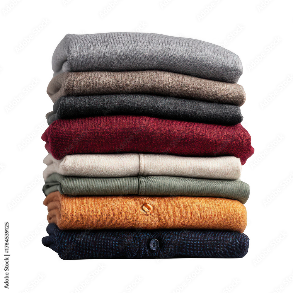 Neatly stacked folded cloth textiles warm cozy blankets variety of colors and textures isolated on transparent background #1764539125