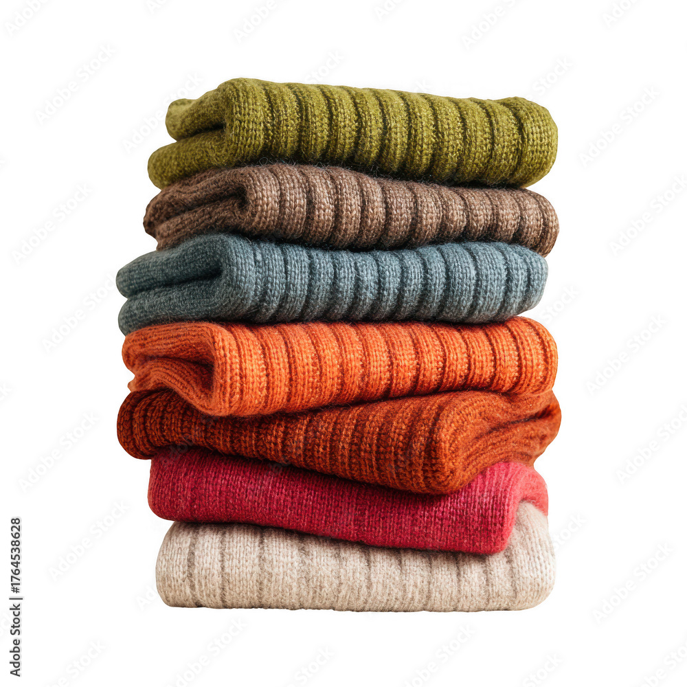 Neatly stacked knitted fabric swatches in various earthy tones for textile design projects isolated on transparent background #1764538628
