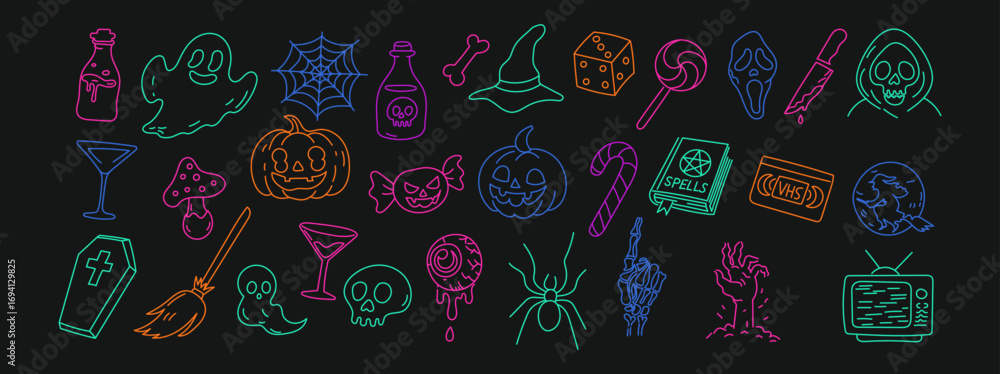 Neon Halloween icons set with pumpkin ghost skull spider witch hat broom potion candy coffin knife spell book eyeball bat skeleton hand retro tv VHS tape flat vector illustration on dark background #1694129825
