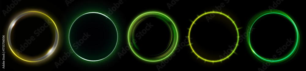 Neon halo rings with green and yellow glow for futuristic interface or gaming design. Circular frames on dark background with vibrant illumination effect. Cyberpunk portal elements collection. #1755706506