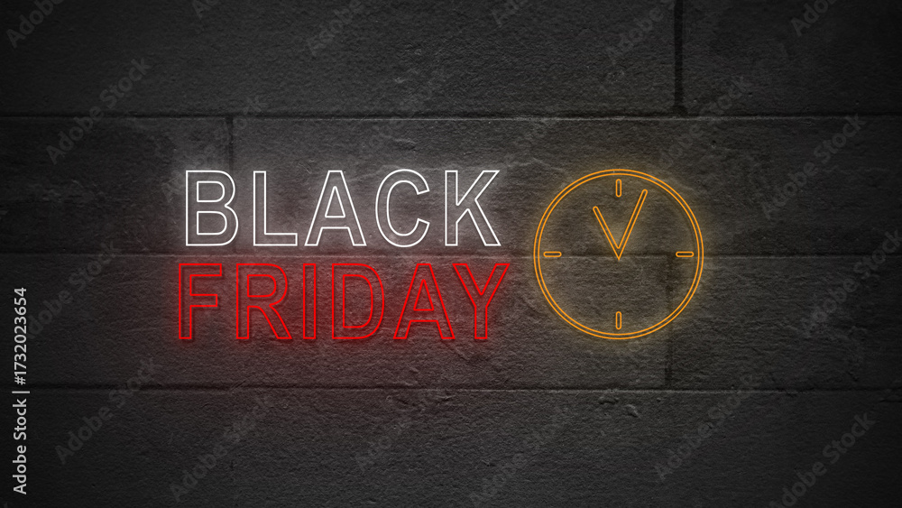 Neon light of clock symbol and Black Friday text on a black background. Copy space. Black Friday sale concept #1732023654