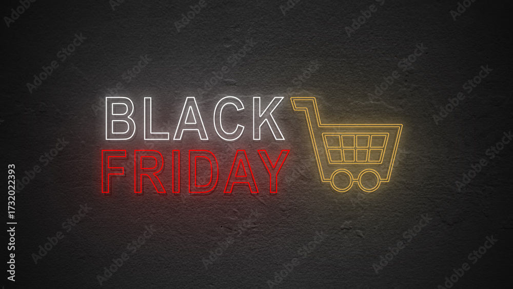 Neon light of shopping cart symbol and Black Friday text on a black background. Copy space. Black Friday sale concept #1732022393