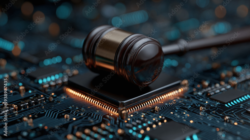 neon lit gavel resting on electronic circuit board illustrating artificial intelligence compliance systems regulatory governance business integrity and digital risk management #1938987435