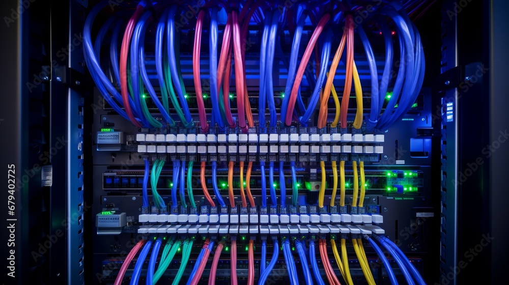 Network equipment. Server, NAS, SQL. Wires connect equipment. Network hardware. Cloud Storage. Digital cloud real estate. Equipment for system administrator. Structured cabling systems. #679402725