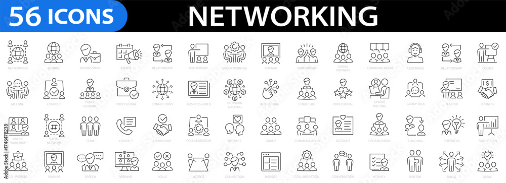 Networking line icon set. Network, partnership, connections, contact, relationship, seminar, online networking, discussion, community, events, social network and mope. Vector illustration #1746478238