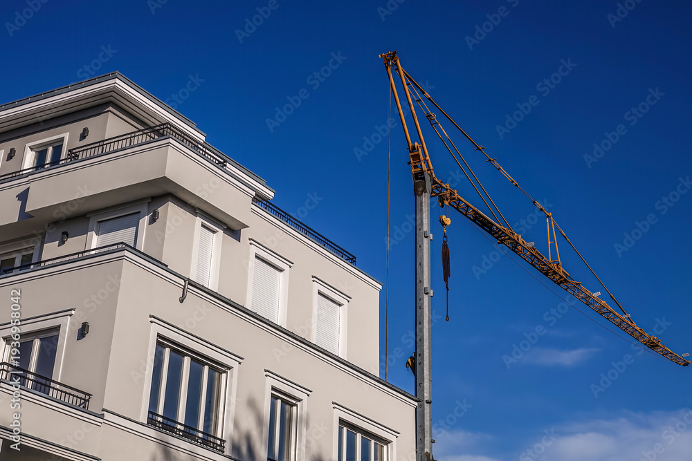 Neubau mit Baukran unter blauem Himmel #1936958042
