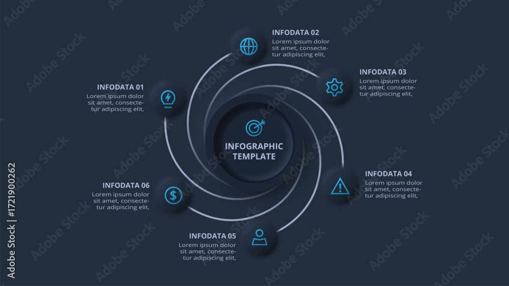 Neumorphic flowchart dark iinfographic. Creative concept for infographic with 6 steps or processes. #1721900262