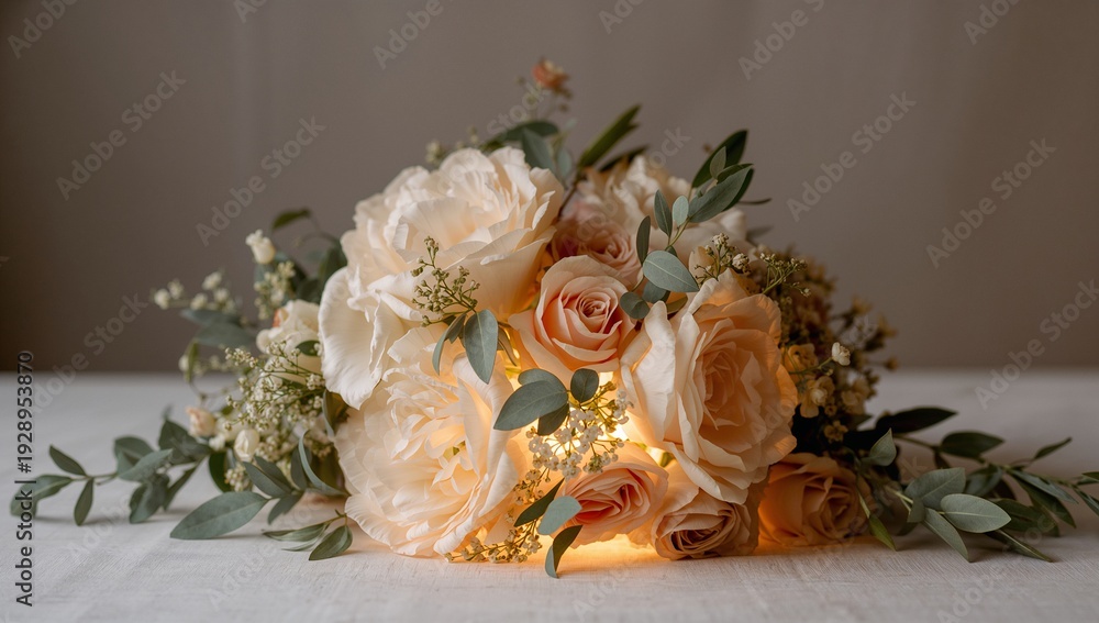 Neutral-toned bouquet centerpiece glowing gently #1928953870
