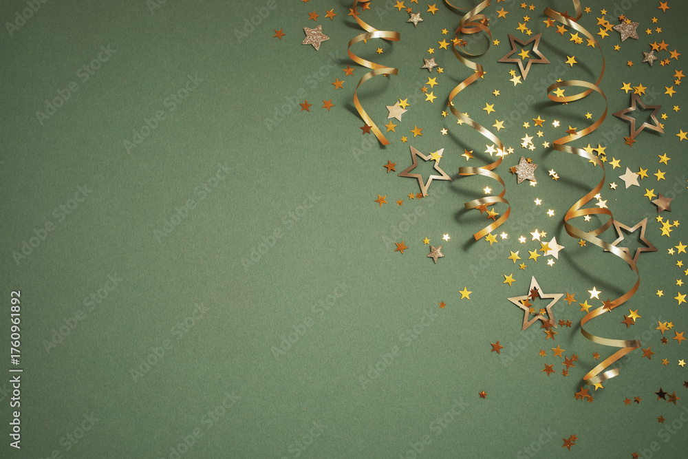 New Year, Christmas or birthday festive background top view. Celebration composition with golden confetti stars and serpentine party streamers. #1760961892