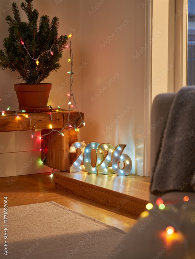 New Year's Eve 2026 illuminated sign with festive lights and small Christmas tree, creating a warm, cozy holiday atmosphere #1771897084