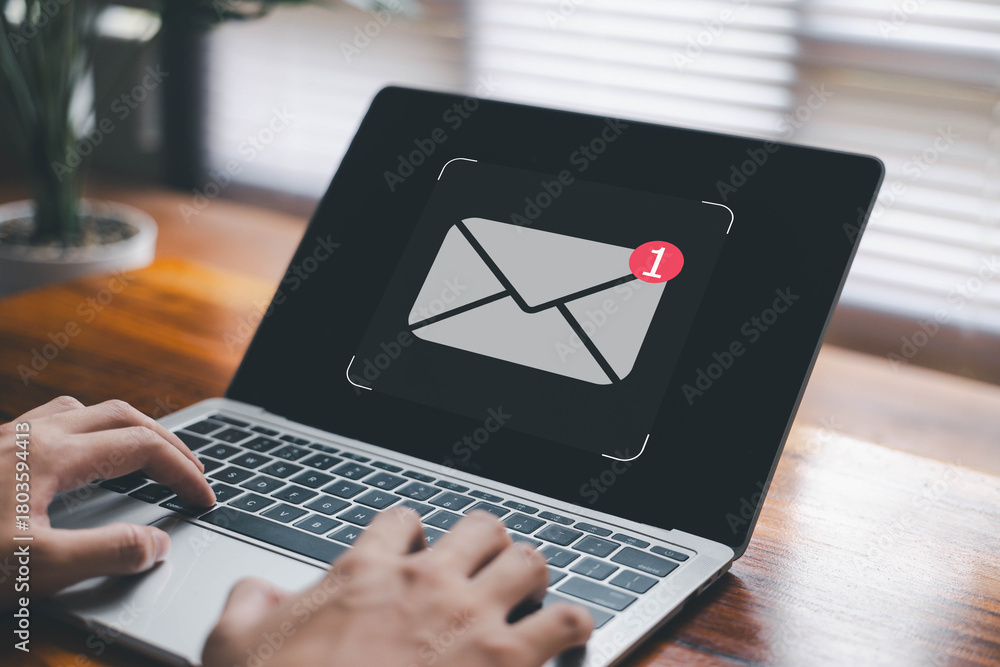 Newsletter notification and open mail from the laptop. concept of correspondence, and news for campaign marketing. icon email, business communication, send information in a digital #1803594413