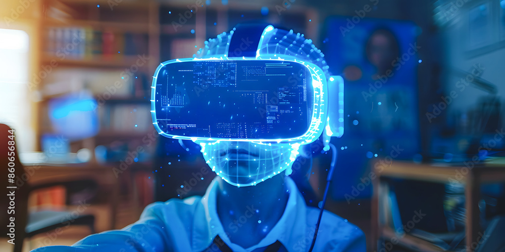 Niña con lentes de calidad virtual en el ciber espacio diseño futurista en una oficina #860656844